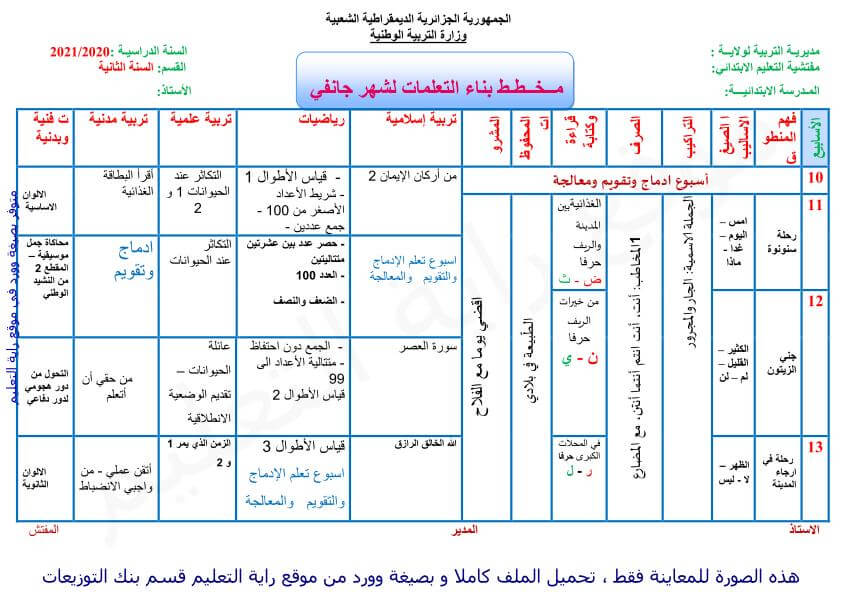 تحميل التوزيع الشهري لشهر جانفي 2021 للسنة الثانية ابتدائي الجيل الثاني ووردword